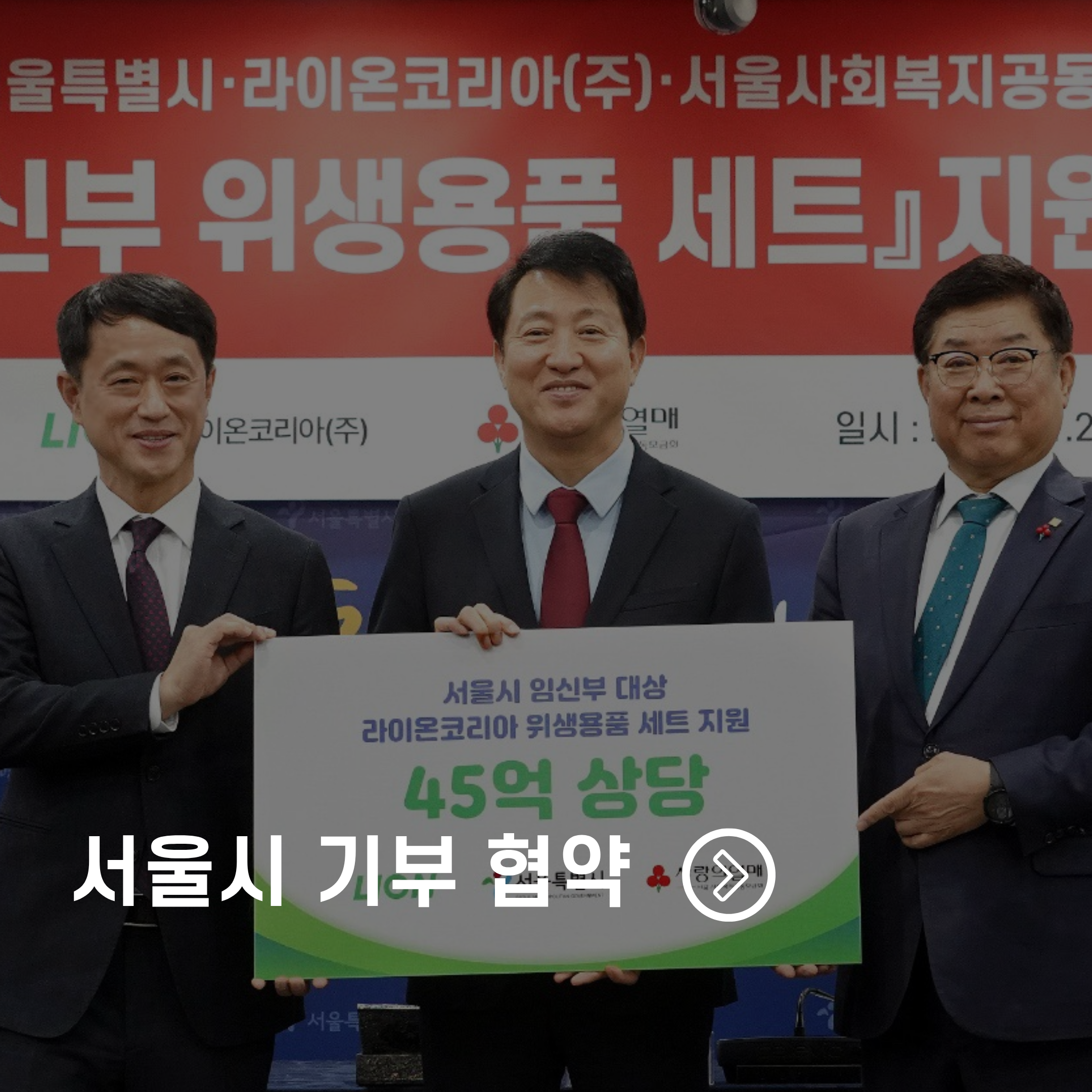 2024년부터는 서울시와의 기부 협약을 통해 2028년까지 서울시 등록 임신부를 대상으로 ‘아이!깨끗해’ 핸드워시와 ‘시스테마’의 치약 & 칫솔로 구성된 <아장아장 위생용품 세트>를 제공하고 있습니다.